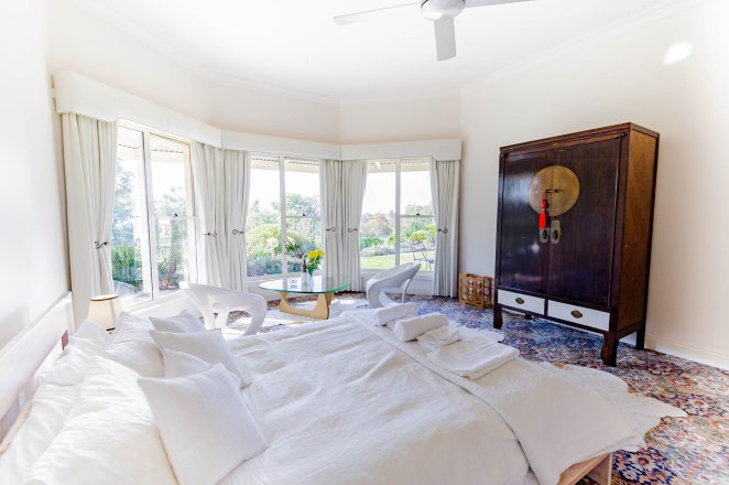 Spacious Bedroom featuring modern luxury style with panoramic views of the garden, the landscape and You Yangs. Wake up with amazing sunrise and chill out in the afternoon with a glass of local wine.